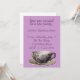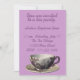 Auf der hübschen lila Einladung befindet sich eine Blumentee-Tasse am Ende der Einladung. Die Informationen zum Party werden in einem dunkleren lila Bereich über der Teetasse angezeigt. Diese schöne Einladung wird jedem Gast ein willkommenes Gefühl vermitteln.