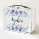 Mittagsschachtel mit romantischem Blau- und lila Blumendesign und individualisierbarem Namen oder Monogramm.