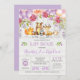 Niedliche und mädchenhafte Babydusche mit bezaubernden Tieren aus Aquarellwald, umgeben von violetten Blumen und grünen Blätter