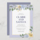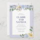 Das Design besticht durch seine eleganten Aquarellelemente in verschiedenen Farbtönen, die aus rostfreien Püppchen, Blues und Golden bestehen. Das Design umfasst auch verschiedene Grünarten und Äste in Grüntöne und Pfefferminztöne. Die Rückseite dieser schlichten, eleganten Einladung ist ein tieferer Schatten des lila.