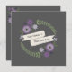 Eine Hochzeitseinladung, die eine Illustration der lila Blumen und des Grüns kennzeichnet, vereinbarte in einem Kreis mit Fahne in der Mitte. Personifizieren Sie mit Namen. Gegenüberliegende Seite kennzeichnet die oben verlassenen Blumen und unteres Recht. Personifizieren Sie den Text mit Details Ihrer Gelegenheit. Hintergrund ist grau. Benennung ist von den Eltern der Braut.