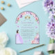 Diese schöne, bogenförmige Acrylquinceñera-Einladung besticht durch eine obere Grenze aus blassrosa und lila Rosen, die sich über einen goldenen Tiara ragen. Ein dunkelhaariges Mädchen in einem Lavendelprinzessenkleid und kleine Lavendelschmetterlinge schmücken den Text. Das Wort "Quinceañera" und der Name des Ehrengast erscheinen in elegantem Laivender-Handschrift, der Rest in grauem Sans Serif-Schriftart auf einem klaren oder mattierten Acrylhintergrund.