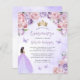 Diese schöne Quinceañera Einladung zeigt eine Grenze von lila lila und rot rosa Rosen auf einem lila Aquarell. Eine goldene Tiara, ein brünettes Mädchen in einem lila Prinzessenkleid und kleine lila Schmetterlinge schmücken den Text. Das Wort "Quinceañera" und der Name des Ehrengast erscheinen in eleganter lila Handschrift, der übrige Text in grauem Sans Serif Schriftart. Fügen Sie auf der Rückseite zusätzlich einen QR-Code hinzu, um Ihren Gästen zu helfen, Ihre quinceañera Website und UAWG online zu besuchen.