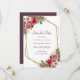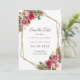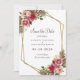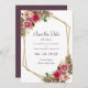 Elegante schicke botanische Save the Date-Karte mit romantischer, blumengeschmückter Wasserfarbe, die auf einem klassischen weißen Hintergrund in üppiger Vegetation dargestellt ist. Ein glänzender, goldfarbener, geometrischer Kristallrahmen sorgt für eine trendige Touch. Traditionelle, klassische Formulierungen sorgen für zeitlose Eleganz. Persönliche Hochzeitsdetails für Ihre Gäste in eleganter lila Cassis Schrift und Schrift. Die Rückseite der Karte ist schön passend lila.