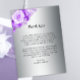 Teilen Sie Ihre Dankbarkeit auf eleganteste und unvergesslichste Weise mit unserer "Lila botanischen Rose in Silver" Hochzeitskarte. Das Design besticht durch einen hübschen Bouquet mit lila und weißen Rosen in einer Ecke und einen glamourösen silbernen Hintergrund. Auf der Kartenrückseite befindet sich ein zweites lila Rosenbukett, zusammen mit einer Website-Adresse für Ihre Hochzeitswebsite, die Sie mit der Adresse Ihrer eigenen Website anpassen können. Der herzliche Text kann leicht mit Ihrer eigenen speziellen Nachricht für Ihre Familie und Freunde personalisiert werden, oder Sie können einfach die Wörter so verlassen werden, wie sie sind (aber denken Sie daran, die Namen der frisch verheirateten Paare unten zu ändern!)