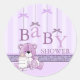 Dieses moderne Babyduschenaufkleber mit lila Bögen. Passen Sie es an, indem Sie Ihre Daten im Schriftart Ihrer Wahl hinzufügen!