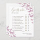 Lila und goldene Schmetterlinge, handgezeichnet in Aquarellfarbe und digital mit Gold und Glitzern geschichtet (das ist keine echte Folie!) dekorieren dieses einfache und elegante, schicke Brautparty "Raten Sie, wer...", eine Spielkarte mit moderner Skriptkalligraphie. Personalisieren Sie es vollständig, mit dem Namen der Braut und dem Datum und jeder der zehn Fragen.