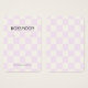 Ohrring-Grafikkarte mit einem niedlichen lila karierten Muster. Vorlagenlöcher können angepasst oder gelöscht werden, sowie alle Ihre Firmeninformationen. Fügen Sie Ihre Social Media oder Webseite ganz unten hinzu.