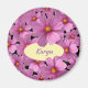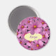 Ein Foto einer lila Kosmos-Blume mit gelbem Mittelschnitt-Ausschneiden und in einem zufälligen Muster auf einem schwarzen Hintergrund platziert, der auf einem runden Magneten gedruckt ist. Sie können die Hintergrundfarbe auf das ändern, was Sie wollen. Es ist die gleiche Blume, die unterschiedlich groß und gedreht und oft platziert ist, um ein natürliches Aussehen zu erzeugen. Personalisieren Sie Ihren Namen oder anderen Text mit Zazzle's vielen verschiedenen Schriftart Stilen und Farben oder entfernen Sie das Text- und Textfeld komplett. Dieses Muster kann auf andere Produkte übertragen werden. Wenn Sie Hilfe benötigen, zögern Sie bitte nicht, mich zu kontaktieren, und ich werde Ihnen gerne behilflich sein. Sie können mich unter KarenCoffelt@wolfmoonartanddesign.com kontaktieren. Das war ein Foto, das ich in den Garten meines lieben Freundes Karen Leavitt in Massachusetts aufgenommen habe. Ursprüngliches Design Copyright 2008 von Karen Coffelt.