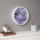 Ein Raum mit einer stilvollen Wanduhr mit weißen Ziffern, die ein Foto mit lila Delphinium-Blüten mit weißen Knöpfen zeigt, wird gehoben. Ein schönes, blumengeschmücktes Design! Wählen Sie Stil und Größe der Uhr aus. Verwenden Sie zum Dekorieren eines Wohnzimmers, Esszimmers, Küche, Schlafzimmers oder eines anderen Zimmers.