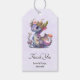 Geschenk Tag mit einer Illustration eines mythischen Drachen. Lila und blaue Waage. Eine geblümte Goldkrone mit Hörnern schmückt den Kopf. Magisch, lustig und freundlich.