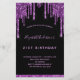Eine mädchenhafte und weibliche 21. (oder jedes Alter) Geburtstagsfeier Einladung. vorne: Ein schicker schwarzer Hintergrund. Dekoriert mit dunklen lila Imitaten Glitzer Tropfen, Farbe Tropflook. Personalisieren und fügen Sie einen Namen und Party-Details hinzu. Der Name wird mit einem handgeschriebenen Stilskript geschrieben, mit lila, hellen Buchstaben.