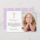 Feiern Sie stilvoll die Erste Heilige Kommunion Ihres Kindes und bedanken Sie sich bei Ihren Gästen für ihre Anwesenheit mit unseren exquisiten First Heilige Kommunion Danksagungen. Mit einem atemberaubenden Gold-Effekt-verzierten Kruzifix und einer anpassbaren Botschaft, die es Ihnen ermöglicht, Ihre Dankbarkeit an Ihre Familie, Freunde und Angehörigen zu äußern, die diesen besonderen Moment mit Ihnen und Ihrem Kind geteilt haben. Darüber hinaus kann man die Karte mit dem Namen Ihres Kindes in einem wunderschönen Script-Schriftart personalisieren, was sie zu einem wahrhaft einzigartigen Sake für alle macht, die sie erhalten. Und wenn das nicht genug ist, können Sie der Karte auch ein Foto Ihres Kindes hinzufügen, was es zu einem hochgeschätzten Medaillon für die nächsten Jahre macht. Auf der Rückseite der Karte sorgt ein lila-weißes, stilvolles Kreuz-Muster für eine raffinierte Touch, die Ihren Gästen einen bleibenden Eindruck hinterlässt. Mit unseren First Holy Communion Dankeschön Karten können Sie sich auf elegante und herzliche Weise bedanken.
