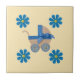 Handgeschnittene Pfirsichkutsche mit blauem Bogen und blauem Band und geklebten blauen Tasten auf den Rädern, hellgelber Hintergrund auf Keramik Foto Tile für Küche und Wohngestaltung. *Alle Dinge, die Sie auf den Produkten sehen, sind handgefertigt, aber Sie müssen wissen, dass Sie ein Foto bekommen!
