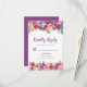Schöne lila und rosa Blume mit einem Hauch von Blau schaffen wunderschöne Blumenrahmen entlang der oberen und unteren Ebene dieser RSVP-Karte. Kindly Reply ist in großen lila Schriftzeichen geschrieben. Die Rückseite der Einladung ist ein tiefes lila. Dies kann in jede Farbe geändert werden, um Ihre Hochzeitsdekoration zu ergänzen. Die Textfarbe, die Schriftgröße und der Schriftart können ebenfalls angepasst werden.