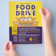 Lila und gelbe Lebensmittel Laufwerk Fundraising-Flyer bietet Pappschachteln mit Dosen gefüllt mit Lebensmitteln. Flyers Zweck ist es, Lebensmittelspenden zu fördern, um den Hungernden füttern.