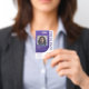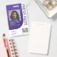 Modernes und trendiges Foto Pressemappe Abzeichen. Unser Design zeichnet sich durch ein modernes und trendig lila gebogenes Design aus. Mit Foto, Name, Logo, Ablaufdatum und Gültigkeitsdatum sowie optional mit Mitarbeiternummer versehen. Die Rückseite ist mit einem trendigen, gebogenen Design in drei Farben versehen (Farben können in Anzug Ihrer Marke geändert werden).