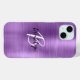 Dieses elegante personalisierte Handy verfügt über ein Monogramm und einen Vornamen in modernem Schwarz-Weiß-Drehbuch auf einem lila, gebürsteten Metallhintergrund.