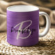 Diese elegante personalisierte Kaffee-Tasse zeichnet sich durch ein Monogramm und einen Vornamen in modernem Schwarz-Weiß-Script auf einem lila gebürsteten Metall-Hintergrund aus.