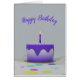 Ein lila Geburtstagskuchen aus Cartoon mit sprinklerbedecktem Zuckerguss, der die Seiten hinunter läuft, und eine beleuchtete Kerze sitzt auf einer goldenen Platte auf einem Tresen, der mit bunten Punkten bedeckt ist.