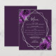 Dieses elegante, moderne Hochzeitsmenü besticht durch einen silbernen geometrischen Rahmen, der mit lila Pflaumenbouquets und silberfarbenen Blumenbouquets auf lila Hintergrund dekoriert ist. Der anpassbare Text kombiniert silbergraue, weißliche Handschrift, Kupferplatte und kursiven Schriftart. Die Rückseite ist lila.