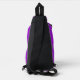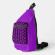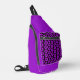Diese lila, quergestreifte Slingtasche mit Reißverschluss geht dahin, wo Sie beim Fahren und Wandern hingehen. Auf der Vorderseite ist die Reißverschluss-Tasche das Bild einer lila Cranesbill Geranium Blume, die auf einem soliden, schwarzen Hintergrund wiederholt wird. Ein lustiges Blumendesign!