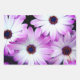Geschenkpapier mit Blättern, die Bilder von violetten Blumen und Herzen haben.