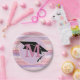 Rosa und lila Aquarellfarben gestreift Graduierungsparty Party Papier Teller für Mädchen mit einem schwarzen Graduierdeckel und Monogramm. Kontaktieren Sie uns für Hilfe bei Anpassungen oder passenden Produkten.