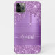 Maßgeschneiderte, elegante Handy-Gehäuse mit lila Imitat Glitzer tropfen vor einem lila Imitat metallische Folie Hintergrund. Personalisieren Sie mit Ihrem Namen in einem stilvollen, weißen Skript mit Swashes.