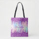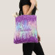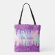 Ein Regenbogen, einfarbiger holografischer Hintergrund. Dekoriert mit rosa und lila Imitaten Glitzer Tropfen, Farbe Tropflook. Personalisieren und fügen Sie Ihren Namen, Monogramm-Initialen, lila und weiße Buchstaben ein. Ihr Monogramm als Hintergrundmuster. Der Name wird mit einem handgeschriebenen Stilskript geschrieben.