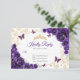 Lila goldene Blumen Quinceanera RSVP Antwortkarte. Merkmale: Schriftart, goldene Schmetterlinge, Aquarellrosen und Tiara. Perfekt für eine elegante Prinzessinnen-Glamour-Feier. Personalisieren Sie mit Ihren eigenen Details.