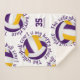 Dieses niedliche Volleyballspiel mit dem Thema Sherpa-Fleecedecke zeigt 5 zufällig arrangierte lila, goldfarbene und weiße Volleybälle mit dem Text "Der Volleyballplatz ist mein glücklicher Platz" in lila Umkreisung jedes Volleyballs in einem lustigen typografischen Schriftart, alles auf weißem Hintergrund - ihr Name und die Jerseynummer sind individuell anpassbar - von katz_d_d_d_zynes