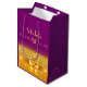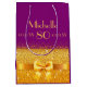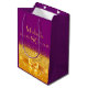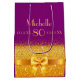 Elegante, klassische, glamouröse und feminine Party Geschenktasche für einen 80. Geburtstag. Ein Imitat goldfarbenes Band und Bogen. Violett, lila Hintergrund. Mit Vorlagen für ihren Namen, Alter, Geburtsdatum und Geburtstag. Goldene Buchstaben.