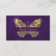 Ein eleganter, tiefer lila Hintergrund mit einem vergoldeten Schmetterling aus Imitaten. Die lila Farbe ist ungleichmäßig. Personalisieren Sie Ihren Namen auf der Vorderseite und fügen Sie ihn hinzu. Zurück: Vorlagen für Ihren Namen, Titel, Telefonnummer, E-Mail und Website-Adresse, QR-Code. Ideal für Unternehmerinnen, Berater, Geschäftsinhaber.