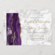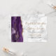 Der links Rand dieser eleganten, modernen Hochzeitseinladung zeichnet sich durch eine lila Aquarellgrenze aus, die mit Imitaten mit goldenem Glitzer bestickt wurde. Der anpassbare Text kombiniert schwarz-goldfarbene Handschrift, Copperplate und kursiv Schriftart auf grauem und weißem Marmorhintergrund. Das graue und weiße Marmormuster wird auf der Rückseite der Karte wiederholt.