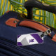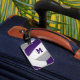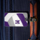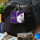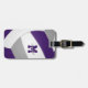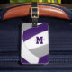 Dieses Gepäckanhänger zum Thema Volleyball eignet sich für ein Mädchen oder einen Jungen und zeichnet sich durch das realistische Bild eines abstrakt übergroßen Volleyballs aus, der lila, graue und weiße Paneele hat - personalisiert mit Spielername und Monogramm vorne, Adresse und Telefonnummer auf der Rückseite - von katz_d_zynes