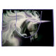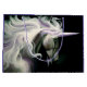 Ein Profil eines weißen Einhorns mit lila Farbe in der Mane im Hintergrund schwarz