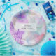 Papier Teller mit einem schönen künstlerischen Bild. Erstellt mit fließenden Alkoholfarben. Lila, grüne und blaue Farben fließen zusammen. Dünne, gewellte Goldbänder vermischen sich mit diesen sanften sanften Farben.