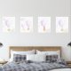 Fügen Sie mit diesen wunderschönen Kunstdrucken die Touchs in das Kinderzimmer oder Kinderzimmer Ihres Babys ein! Das Design umfasst lila Heißluftballon, Tiere (Hase, Bär, Elefant), Mond, Wolken und Sterne.