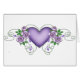 Schönes lila Herz umgeben durch lila Rosen und grüne Reben. Kundengerecht mit Ihrem Text.