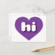 Diese Postkarte weist ein formvolles und lebendiges lila Herz auf, das die fett, weiß, abgerundeten Kleinbuchstaben hi enthält, eine spielerische Abkürzung für Hawaii, den Aloha-Staat. Die Rückseite der Postkarte ist leer und wartet auf Ihre handgeschriebenen Stimmungen oder Ihren personalisierten Text.