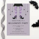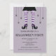 Desteis Halloween-Illustration von lila und weiß gestreiften Hexenbeinen. Die Hexe trägt einen schwarzen Rock und schwarze Schuhe. Die Schuhe haben einige lila Details, und die Hexe ist von Spinnen umgeben. Die Hintergrundfarbe ist leicht lila und es gibt drei personalisierbare Textbereiche, die sich perfekt für die Details des Events eignen. Auf der anderen Seite gibt es einen Hexenhut und weitere Spinnen.