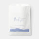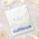 Gastgeschenk Hochzeit Tasche mit Morgenberglandschaft. Weiche blaue Naturlandschaft. Silhouetten von Bergen und Leuchten Blume. Aquarellmalerei Hintergrund Gastgeschenk Hochzeit Tasche. Lila Bergsammlung.