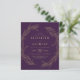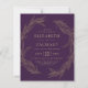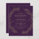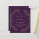 Ein klassisches botanisches Design mit einem Kranz, der von zwei anmutigen goldenen Linien Kunstblättern gebildet wird. Bearbeiten Sie den goldfarbenen Text einfach auf einem lila Hintergrund. Die Rückseite der Karte ist lila.