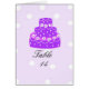 Ein hübscher lila Hochzeitskuchen, elegant dekoriert betont die Tischnummer. Ein weicher Polka-Punkthintergrund. Fügen Sie den Namen und das Hochzeitsdatum der Braut und Bräuche hinzu.