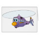 Ein skurriler lila Cartoon-Hubschrauber, der den freundlichen Himmel fliegt.