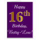 Dieses schlichte Design der Geburtstagskarte zeigt die Meldung "Happy 16 th Birthday", mit dem "16." ein goldfarbenes Imitat. Es verfügt auch über einen individuelle Name und einen lila Hintergrund. Es könnte jemandem gegeben werden, der seinen sechzehnten Geburtstag feiert.