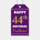 Dieses Geschenk-Tag Design enthält eine Nachricht wie "HAPPY 44. BIRTHDAY, FirstName!", wo der Name personalisiert werden kann und wo die Zahl "44." ein Imitat/eine Imitation goldähnlicher Farbdarstellung hat. Die Vorderseite hat auch einen lila Hintergrund. Auf der Rückseite befindet sich eine "From:"-Zeile. Geburtstagsgeschenke wie diese könnten vielleicht für Geschenke verwendet werden, die jemand zum vierundvierzigsten Geburtstag bekommt. [~Z0000212]