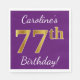 Dieses einfache Papier-Serviette-Design enthält eine Nachricht wie "Caroline 77. Geburtstag!", mit dem "77.", das ein Imitat in goldenem Aussehen auf einem lila Hintergrund hat. Der Name kann angepasst werden. Es könnte auf einer Geburtstagsfeier für jemanden verwendet werden, der seinen siebzigsten Geburtstag feiert. [~Z0000085]
