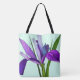Hübsche Totentasche mit Blumenmuster und modernem Überdruck. Lila Iris auf Pfefferminzhintergrund gestrichen. Personalisieren Sie auf Wunsch Ihren Namen.